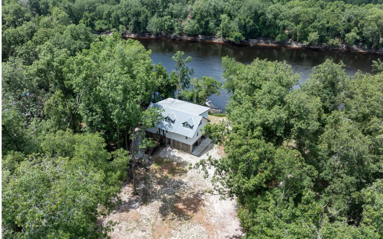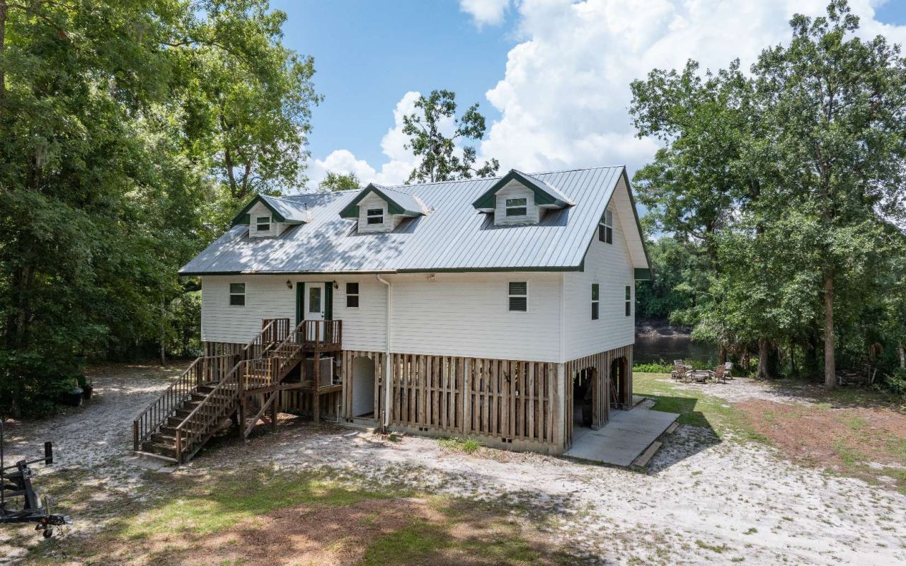 Your expansive riverfront oasis awaits! This spacious 4 bed/3.5 bath home sits less than 60' from the river and offers breathtaking views from each floor. The bottom level is perfect for covered parking and get togethers with an outdoor kitchen set up and lounge area plus a half bath. Enjoy chilly winter nights around the firepit or relax on the multi-level deck overlooking the majestic Suwannee. The main floor of the home offers an open kitchen, living and dining with windows overlooking the river. You'll also find the master suite and an additional bed and bath on this level. Upstairs is the lounge/den area with a wet bar, laundry room, two more bedrooms and a bathroom. Perfect for weekend getaways with the whole family or use it as an Air BnB! One thing to note is this portion of the river and south is free of rocks - important for boaters! Furnishings can stay with an acceptable offer (some exclusions).